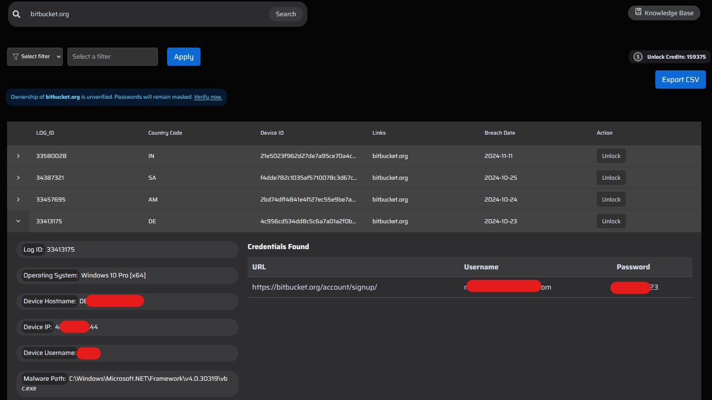 WhiteIntel.io provides powerful search capabilities that allow you to search by domain names, subdomain names, and email addresses. With our advanced search filters, you can quickly identify affected SaaS credentials related to your bug bounty target. For instance, if you are investigating bitbucket.com, you can use our subdomain filter to check if any credentials associated with your target’s name are present. This streamlined approach helps you uncover valuable data efficiently and focus on high-impact findings.