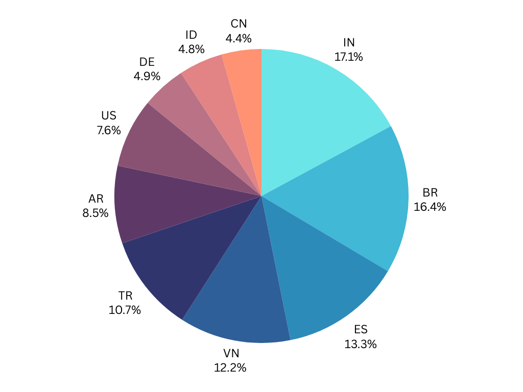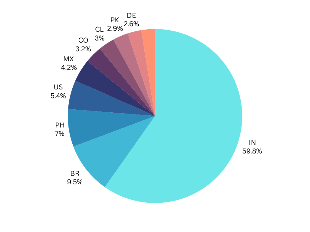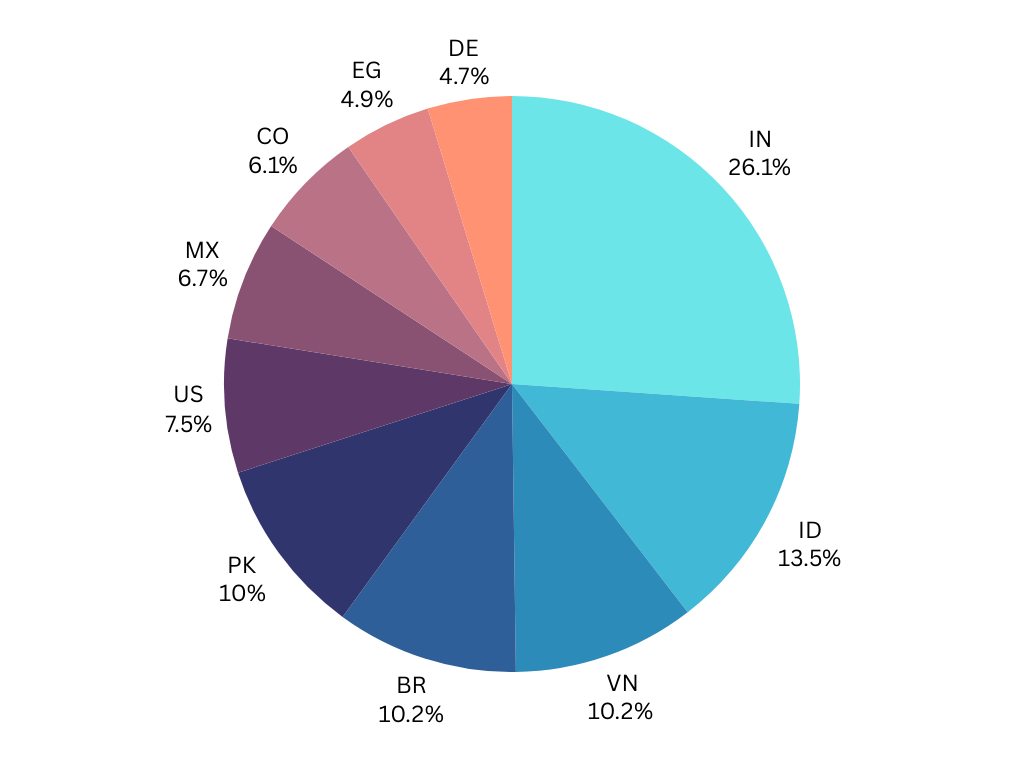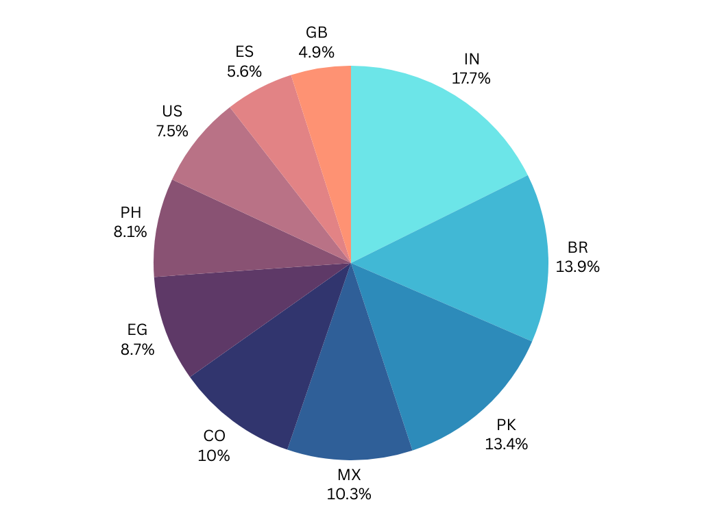 In 2024, WhiteIntel detected credential leaks spanning 90 countries globally. The chart below highlights the top 10 most affected countries.
