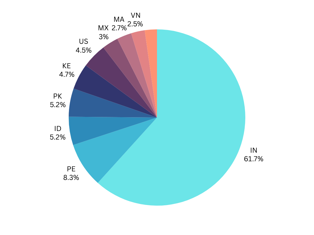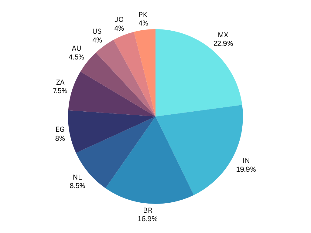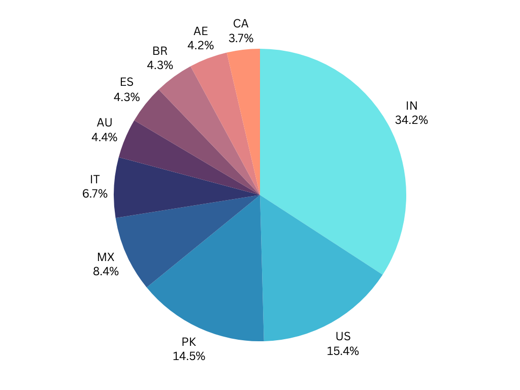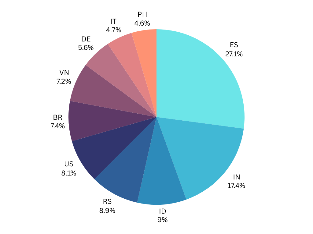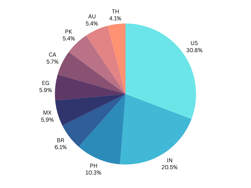 In 2024, WhiteIntel detected credential leaks spanning 90 countries globally. The chart below highlights the top 10 most affected countries.